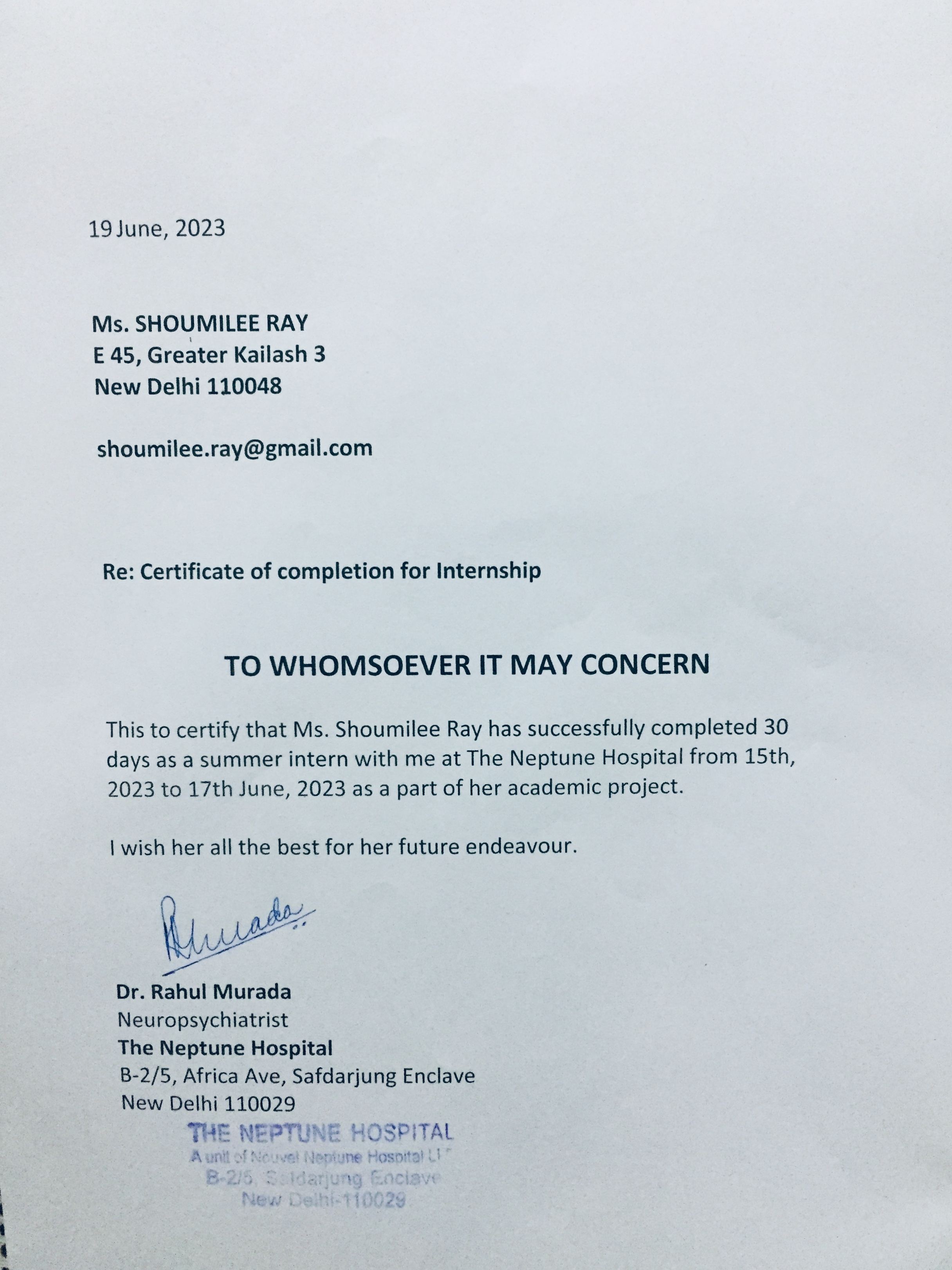 Over a month long of involvement in observing patients and conducting their Mental Status Examination under the mentorship of Dr. Rahul Murada, Neuropsychiatrist, The Neptune Hospital, New Delhi.