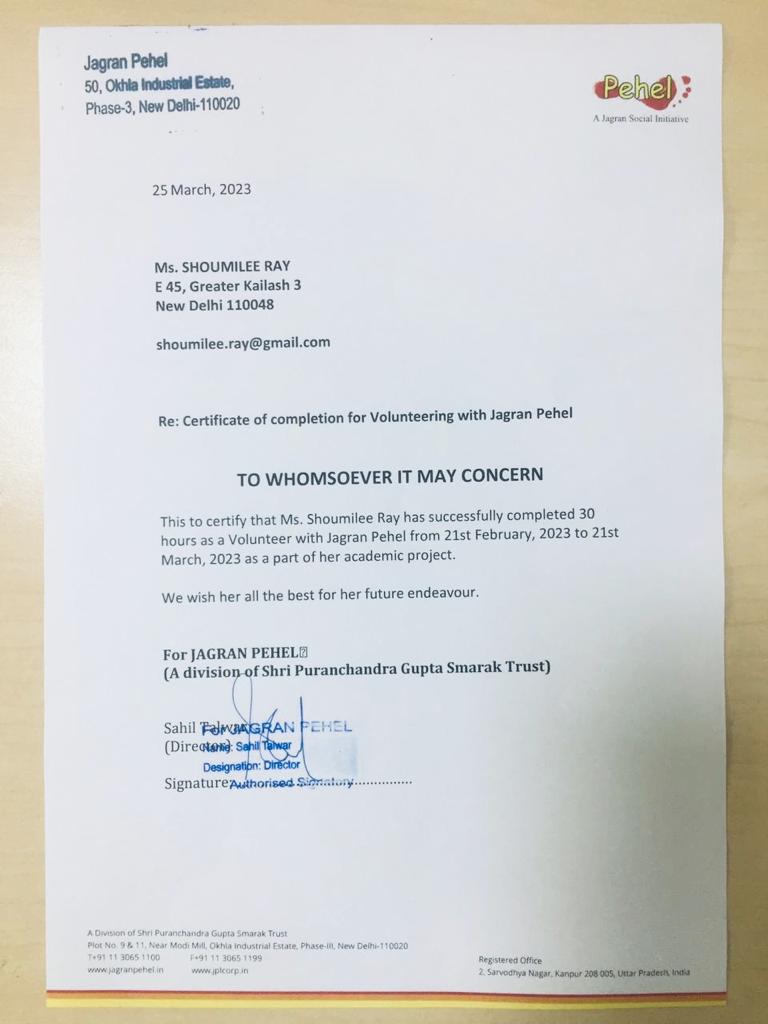 30 hours as Volunteer with Jagran Pehel (A division of Shri Puranchandra Gupta Smarak Trust) for teaching Maths and Art to a class of 25 girls of age group 4 years to 6 years.